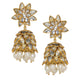 Look radiant in your circle with our Satlada Necklace and earrings. This elaborate and extravagant piece of jewellery is everything you'd want to have in your jewellery stash. Style it with any plain sari to complete your look. Color: White & Gold Material: Gold Finish Base Metal Product Weight: 219 grams...